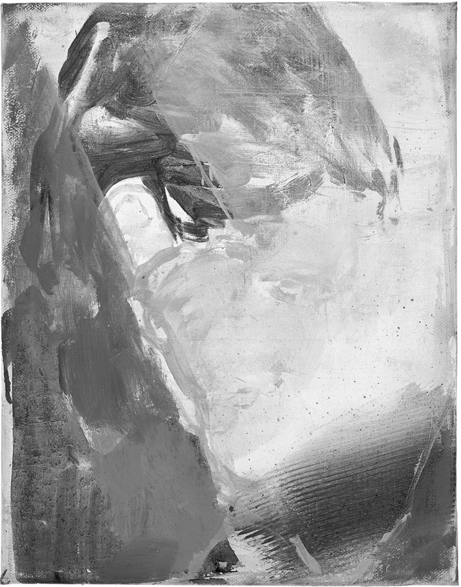 In other pictures, though, as in the large format work Echoes (after Manet), the background also dissolves into restless flecks of colour such that figure and pictorial space coalesce into the same noise. The vertical body of the standing figure is set against the smeared, intermingling tones of the background as nothing more than a transparent form, the outlines marked by a blue-green glow reflected from various points of the surrounding space. The echo in the picture’s title is realised in the reverberation of the colours. Just as a recognisable figure now and then stands out from the blanket of sound produced by Einstürzende Neubauten, here too the object briefly emerges from the background before immediately merging back into it. Lifting itself out of the noise as a lucid and fragile form, the figure describes a brief moment in the process of painting that maintains a tension between clamour and quiet.